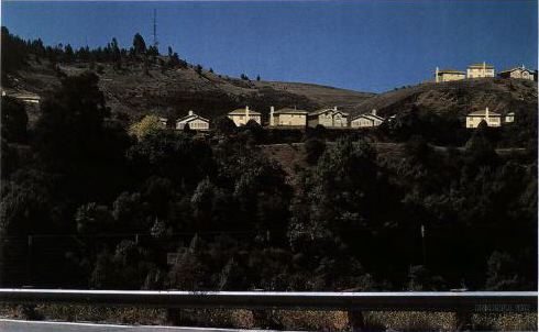 The first picture is a scan taken from Figure 3.8-5, Boulders Residential Development Draft Environmental Impact Report (EIR) prepared for City of San Leandro. The EIR picture is suppose to show us how the proposed project might look from Lake Chabot Dam. Notice how the houses are hidden by shadow . Some houses, below the Fairmont radio tower, are completely hidden in the dark. Why does the City's EIR show an unrealistic picture like this? Compare the City's picture to the second picture prepared by San Leandro Coalition for Responsible Planning (SLCRP). Our picture shows a more realistic view of how the project will look to park visitors. YOU CAN HELP! Contact City of San Leandro officials and tell them you want to see realisic pictures that show the real impacts of housing units proposed for Lake Chabot Park! (Scroll to view a larger pictures)